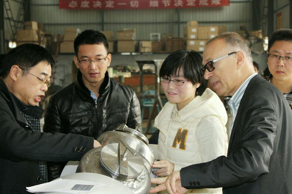 天創技術人員為Bruno先生介紹V型混合機。
