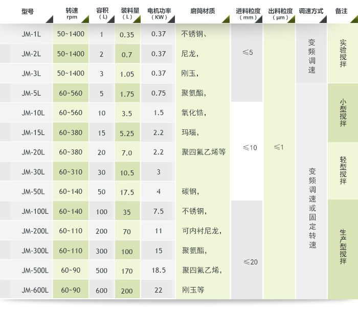 主軸帶動攪拌器高速旋轉,使研磨介質做不規(guī)則的運動,這種雜亂無序運動會產(chǎn)生研磨介質的碰撞、擠壓、磨擦和剪切,從而使物料粉碎、細磨。另外,研磨介質間的大小、形狀及配比不同,其獲得的研磨效果也不同。一般情況下,研磨介質的規(guī)格越大,物料粉碎越粗。反之,研磨介質越小,物料研磨越細。而不同規(guī)格研磨介質的適當配比,再加上速度的適當調節(jié),其研磨效果更佳。